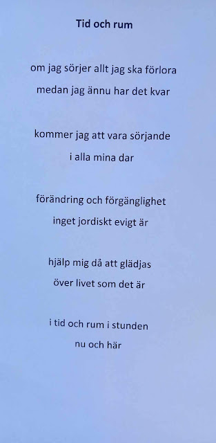 Igår när jag var i samhället och handlade träffade jag min kusin A och hennes C. De hade övernattat i sin stuga, efter att ha firat midsommar med vänner i Onsala. Nu var de på väg hem till Orust, men A läste en av sina dikter för mig, där på parkeringen utanför Konsum.